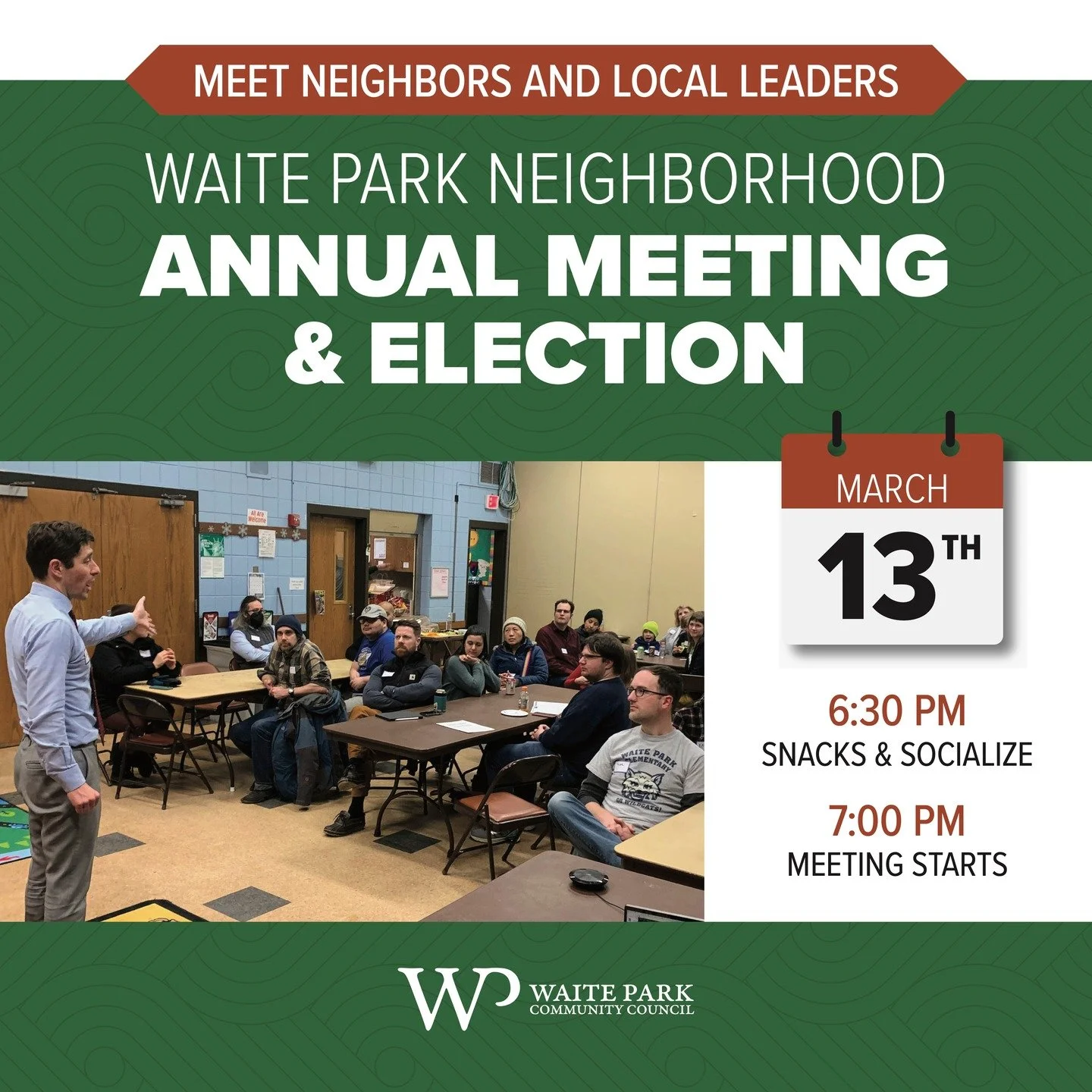 The Waite Park Community Council is a nonpartisan, nonprofit organization dedicated to community building, civic engagement, and quality of life in the Waite Park neighborhood.